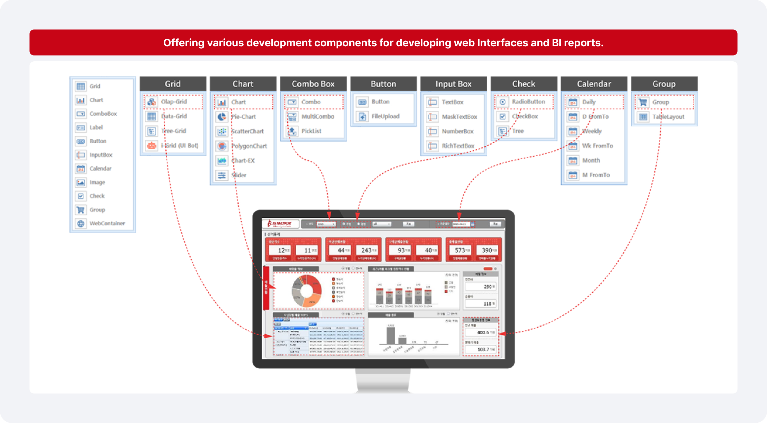 The AUD Platform is a comprehensive solution for developing business system interface. It supports all functionalities previously handled by BI tools, reporting tools, visualization tools, UI/UX tools, and JSP/Java development methods within a single integrated platform. This platform enables the creation of various interface, such as structured/unstructured reports, OLAP, dashboards, and reports, all within one unified system. Additionally, web screens previously developed using UI/UX tools or JSP/Java can be redeveloped quickly and easily, without the need for complex programming processes. Furthermore, the platform incorporates advanced AI technologies to support Low-Code development, allowing users without coding expertise to intuitively and efficiently create business application screens.